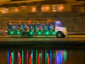 Recorrido por la ciudad en bus típico pintado a mano, con animador, luces y música en vivo.